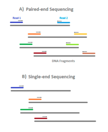 - paired-end sequence each DNA fragement from both sides. Paired-end data is useful when sequencing highly repetitive sequences.